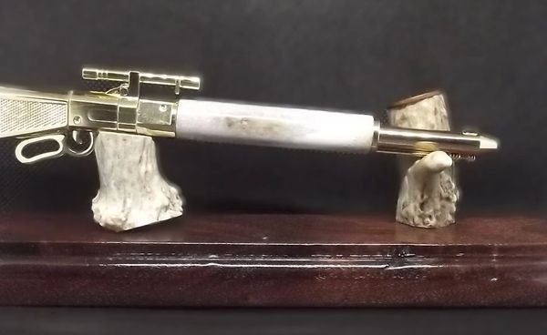 Lever Actions Deer antler Pen Kit to replicate the true forward lever action mechanics of the rifle. Just push the lever down and forward to click and extend the refill and push it down and forward again to reliably click and retract the refill - just like the real thing. The handle symbolizes the classic form of the trigger and lever and easily slides forward to activate the mechanism. The first of its kind mechanism even incorporates a moving-hammer on the top of the back-end cylinder. The pen clip is modeled after a rifle scope. The pen tip depicts the rifle's barrel, front sight, muzzle and tubular magazine. They can be made with any Wood or Acrylic ( Holder is options) Pen Holder add 25.00